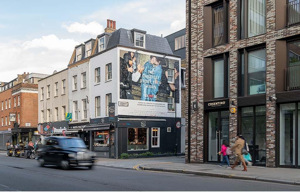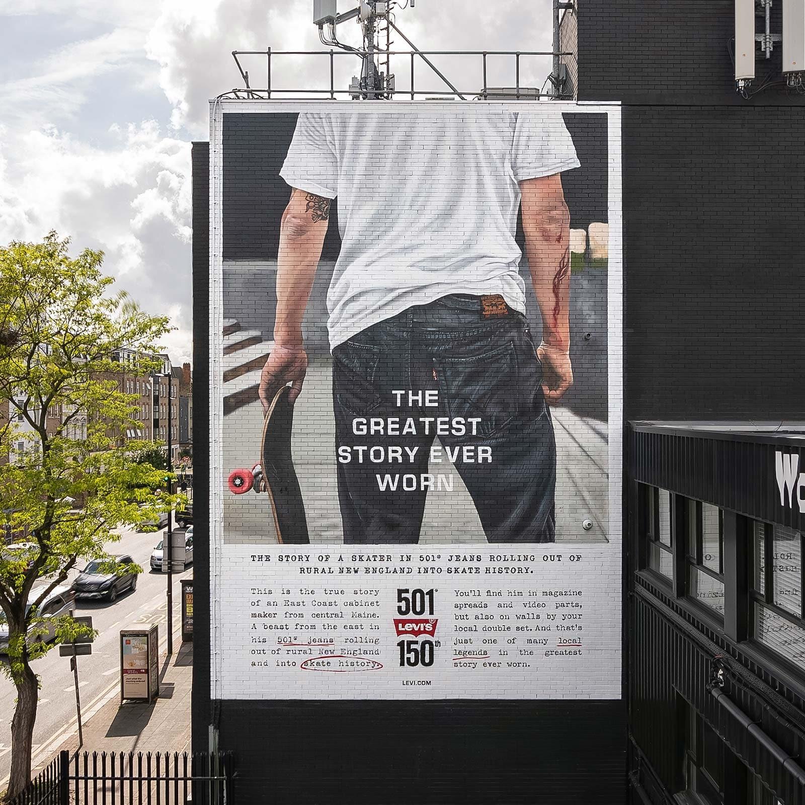 Nous avons célébré cet anniversaire monumental pour la marque en investissant des lieux privilégiés de Londres pendant tout le mois de mai. Nous avons peint à la main quatre incroyables fresques publicitaires à Hackney, Old Street, Truman Brewery et Dray's Walk (près de Spitalfields). Les passants se sont vus rappeler l'identité unique, la créativité et l'authenticité de la marque emblématique de denim.