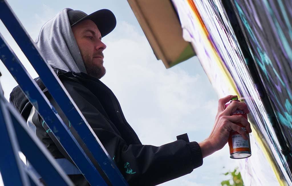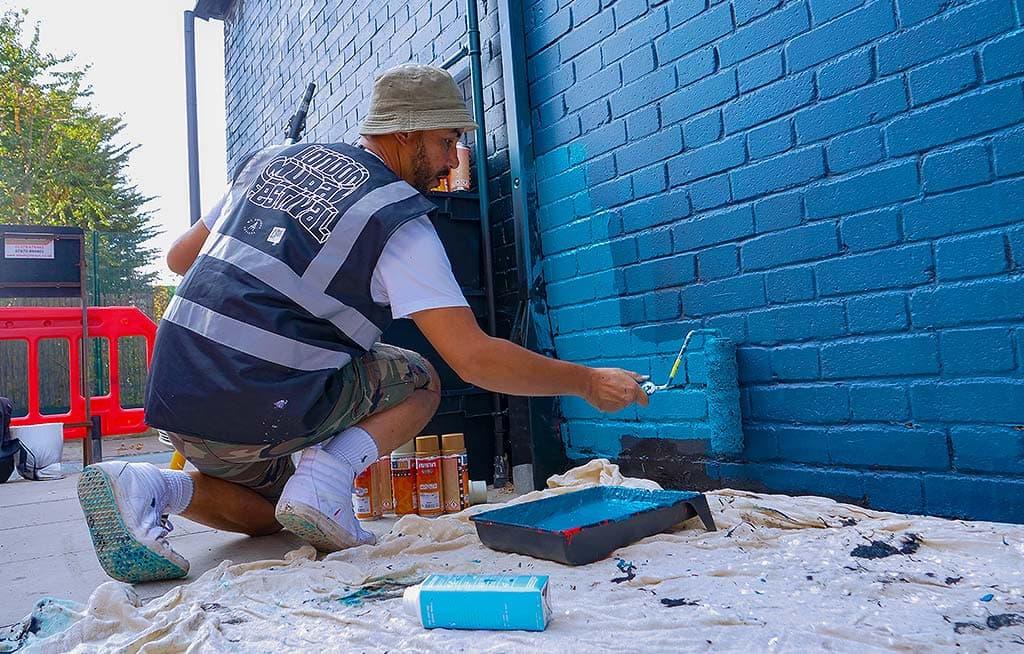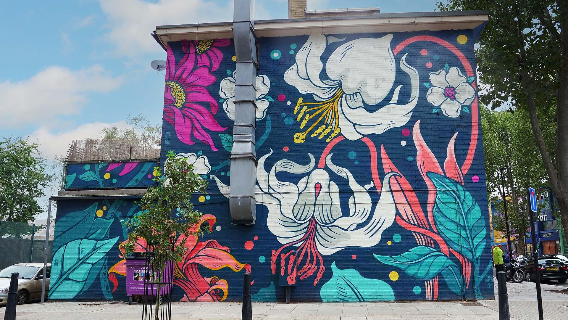 Es war großartig, mit EcoWorld London und Poplar Harca zusammenzuarbeiten, um Aberfeldy Street umzugestalten und sie zu einem lebendigen und kreativen Treffpunkt für die Gemeinde zu machen. Phill Blake und Captain Kris haben die Wände in ihrem eigenen Stil bemalt, beide mit einer Botschaft der Hoffnung für die Poplar-Gemeinde. Captain Kris malte die Worte „Gegen alle Widrigkeiten“ und Phill malte einige leuchtende Blumen in voller Blüte.