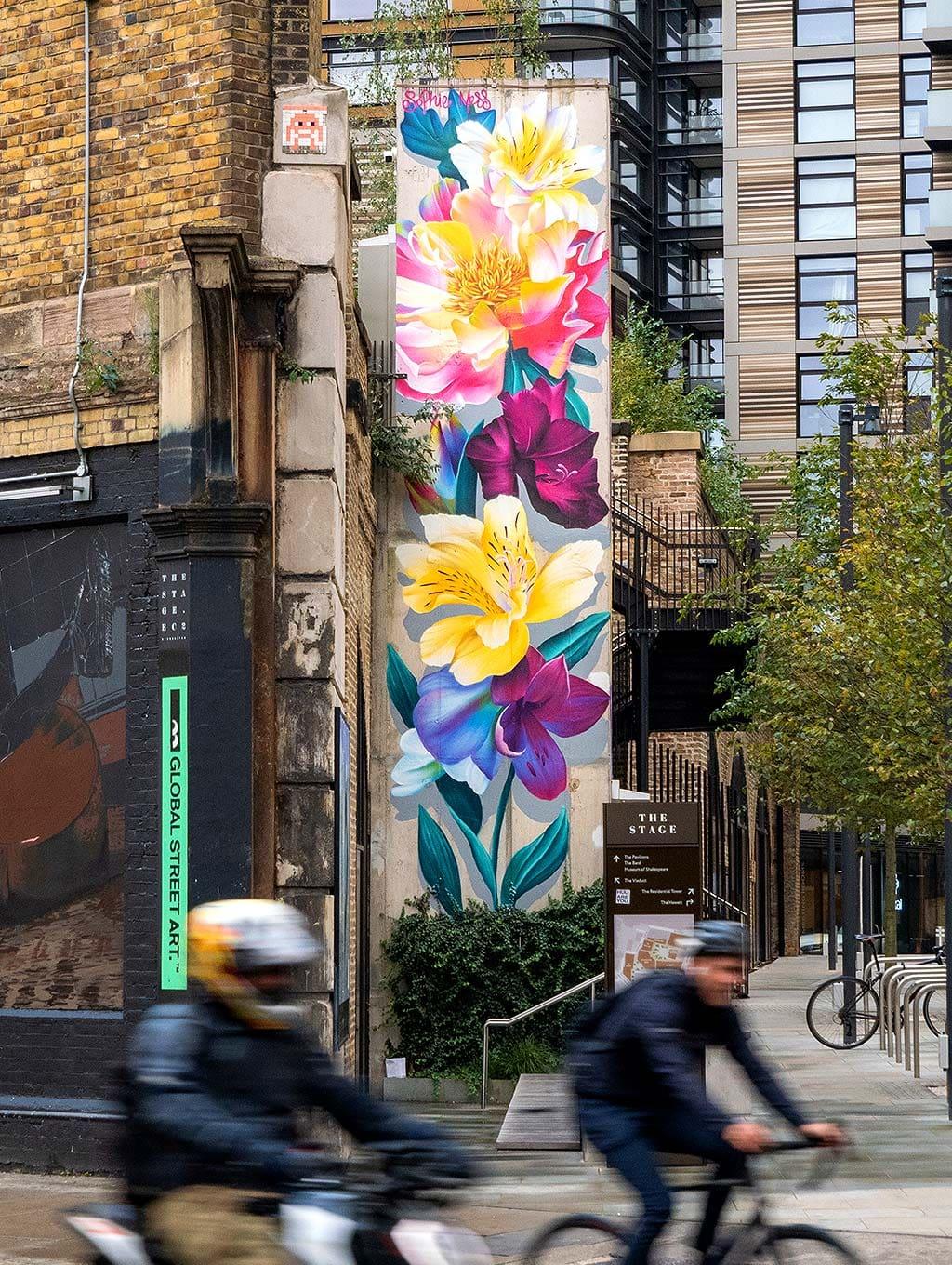 Sie ließ bewusst Elemente des Betons unter ihrem Kunstwerk für das London Mural Festival sichtbar, wodurch der Eindruck entsteht, als würden die überlebensgroßen Blumen nahtlos aus dem Beton wachsen. Das permanente Werk steht stolz auf der Bühne, gleich neben der Great Eastern Street in Shoreditch, und steht allen Passanten zur Verfügung.