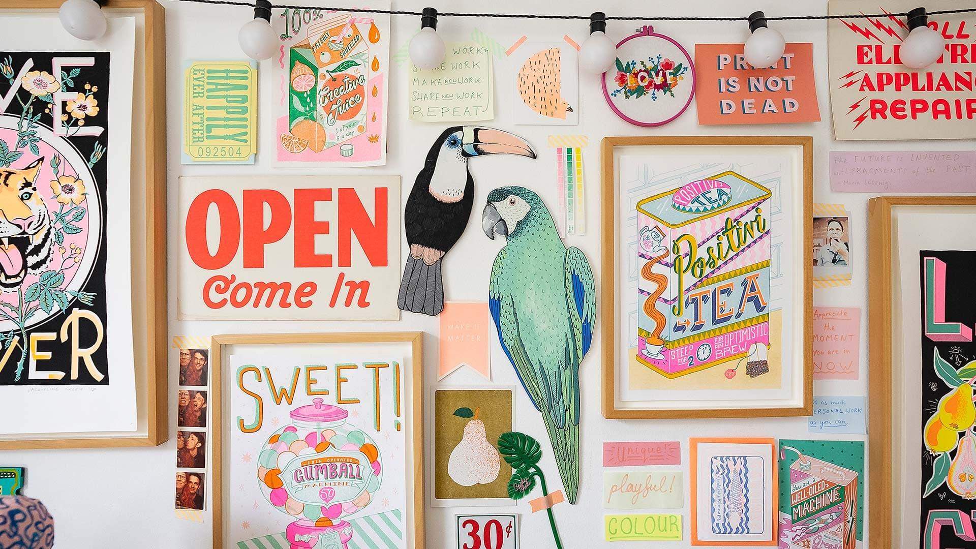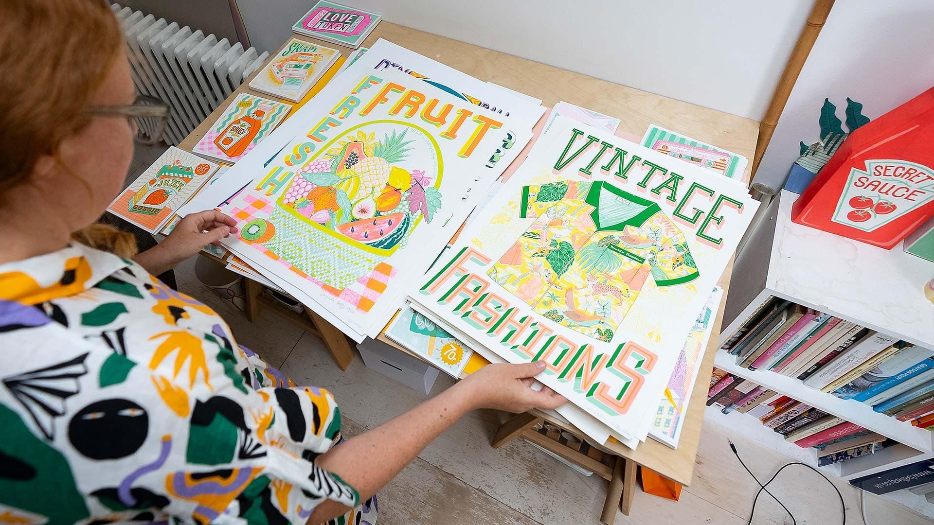 Inspirándose en el diseño de mediados de siglo, los anuncios antiguos dibujados a mano y la tipografía, Jacqueline mantiene su estudio lleno de una alocada mezcla de edificantes efímeros en tonos pastel, que marcan el tono de sus divertidas ilustraciones.