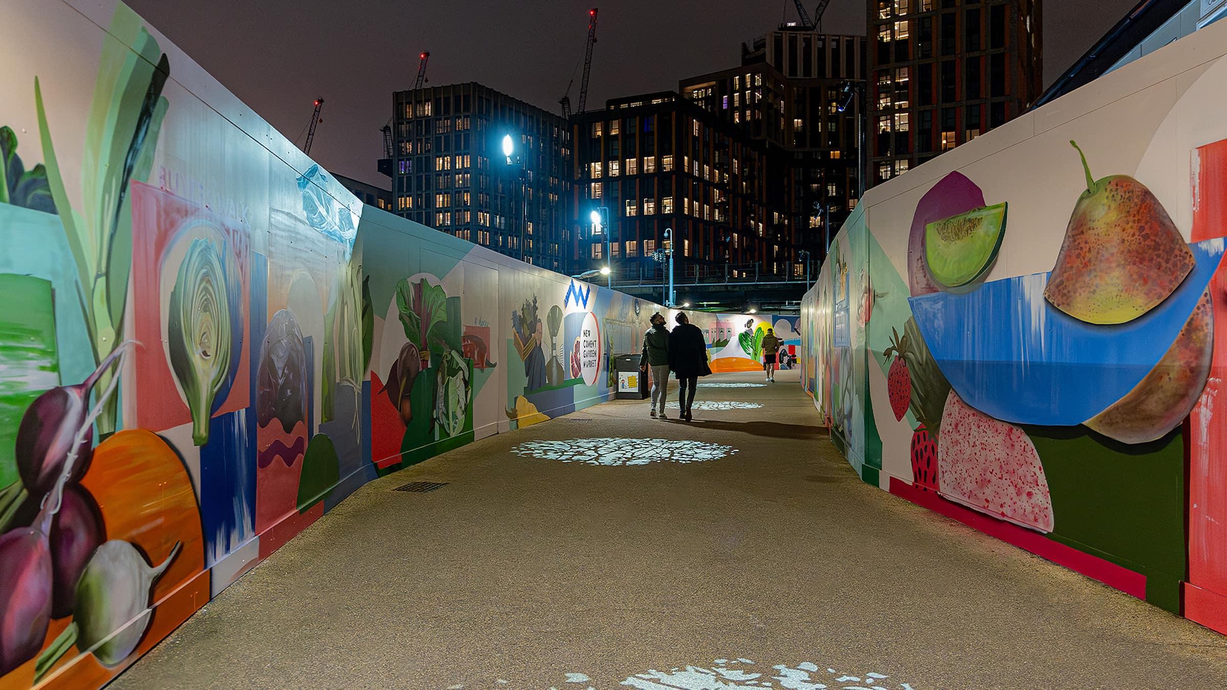 Se nos encargó mejorar la apariencia de Merchant's Way, un pasaje que une la estación Nine Elms con el mercado de New Covent Garden, para celebrar el rico patrimonio de la zona y su continua remodelación.