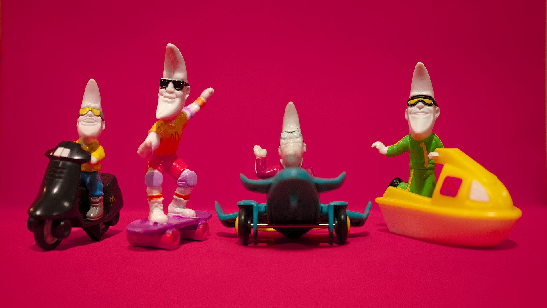 La Happy Meal Table fue creada internamente con el artesano Alan Love (de Furniture of Love). "Tenía una idea de cómo quería que fuera", dice Lee. “Una tapa de vidrio transparente, pero también lados transparentes... No quería que solo pudiéramos mirar los juguetes del Happy Meal.