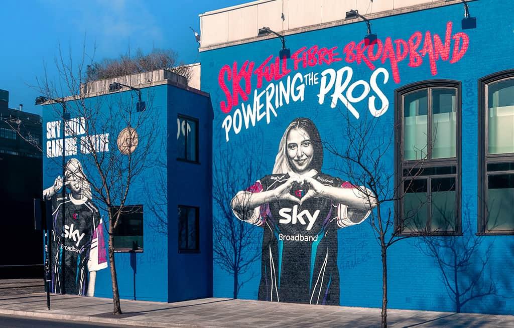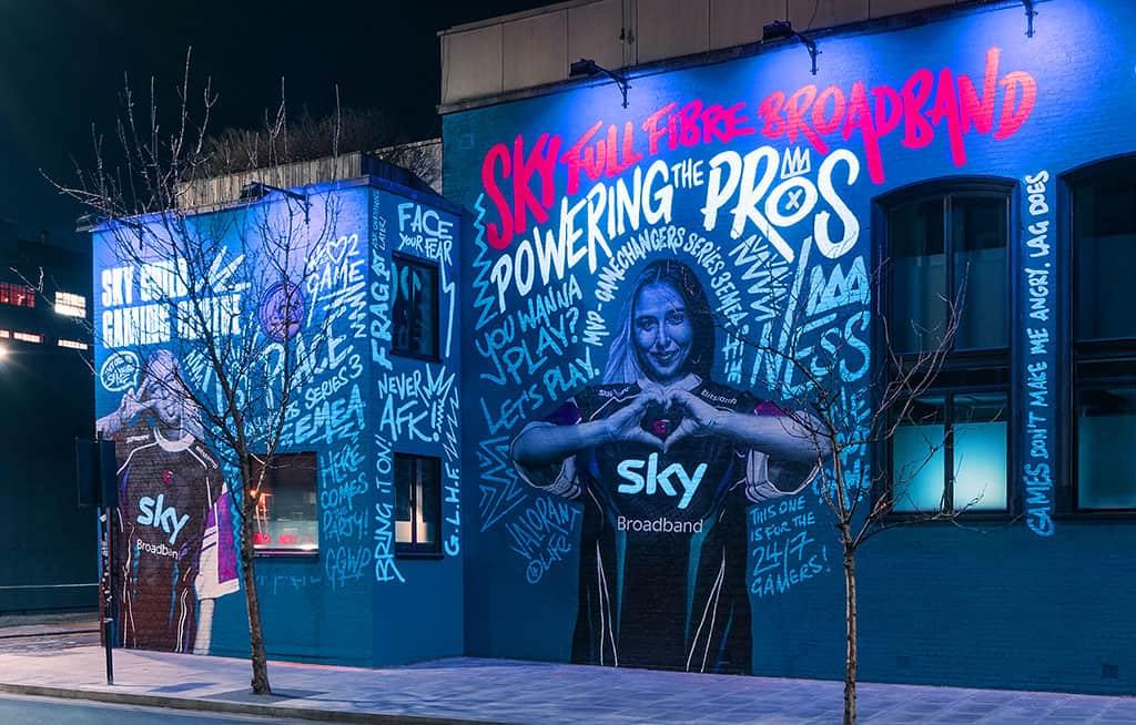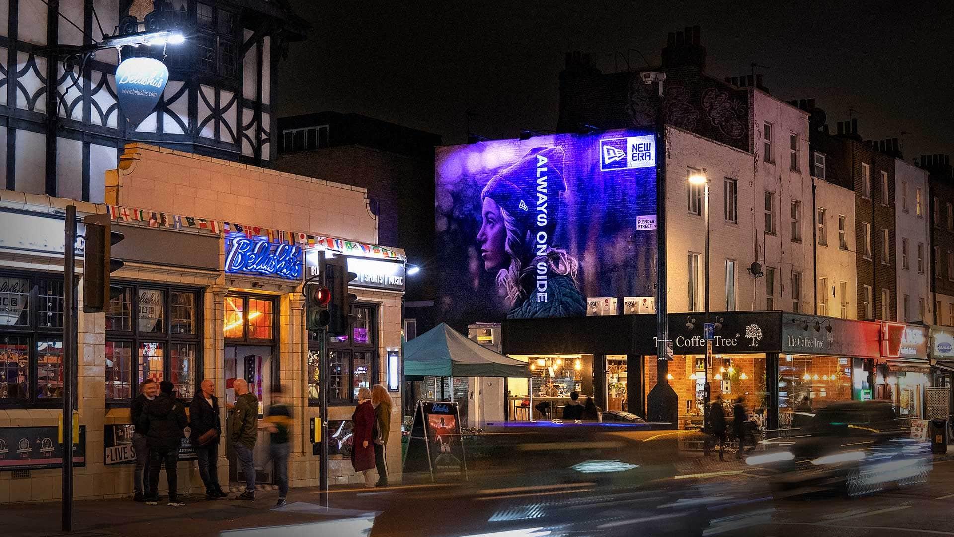 Combined with mural artwork, a static ad is transformed into a moving display with video projection for dynamic storytelling and visual impact at night.