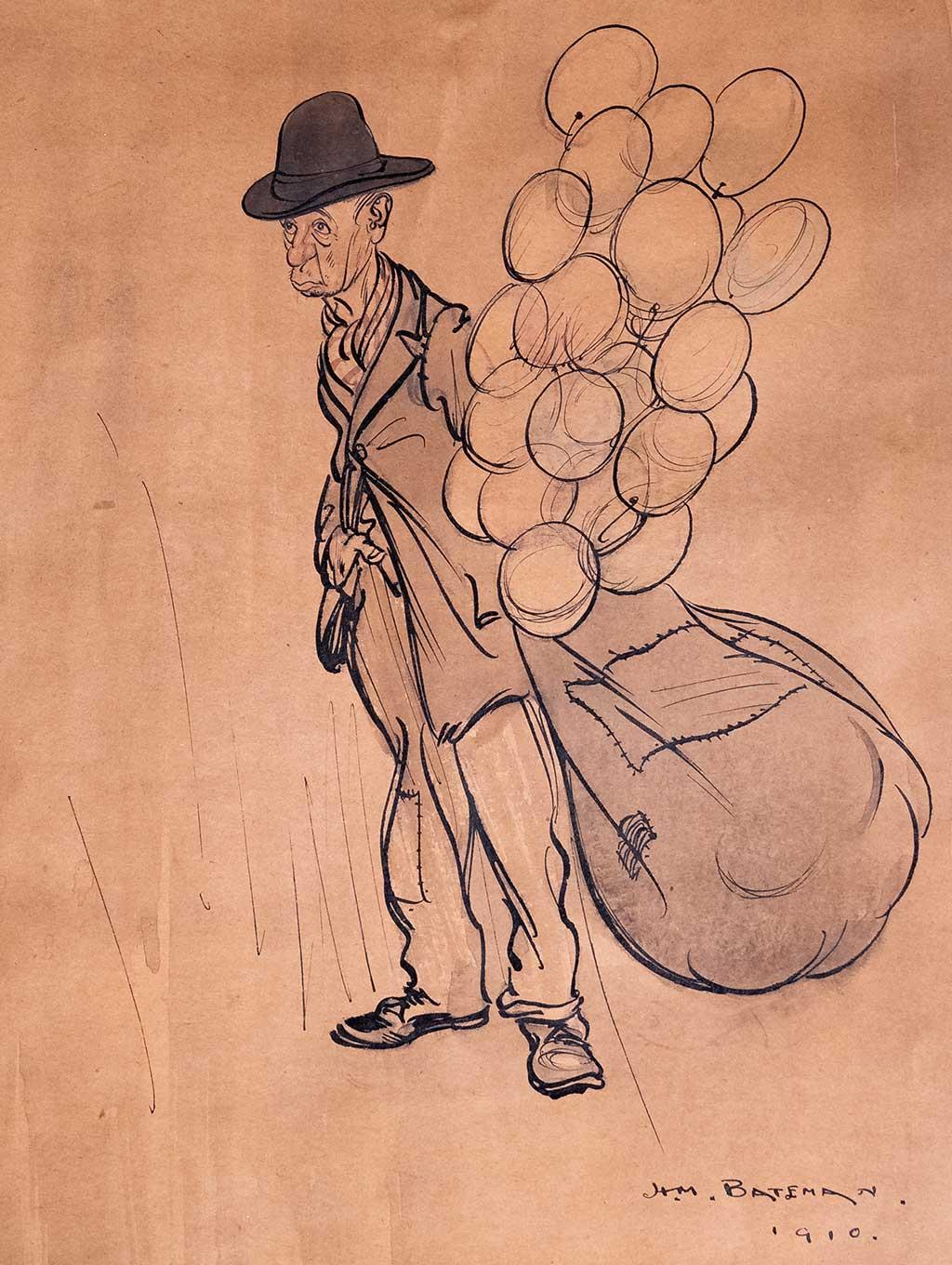Henry Mayo Bateman was known as “the Man Who” drew the 20th Century and has a famous series of cartoons, poking fun at high society, called “The Man Who...”. This particular illustration is a rather melancholy looking balloon-seller. The joy of the balloons is offset by his ragged clothing.