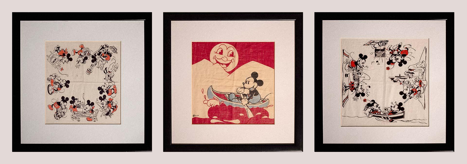 These three silk scarves were produced by Disney in the 1930s. They are remarkably well preserved. Apparently, the former band manager of East 17 was a big fan of early Disneyania. These handkerchiefs used to belong to him before he sold much of his collection.